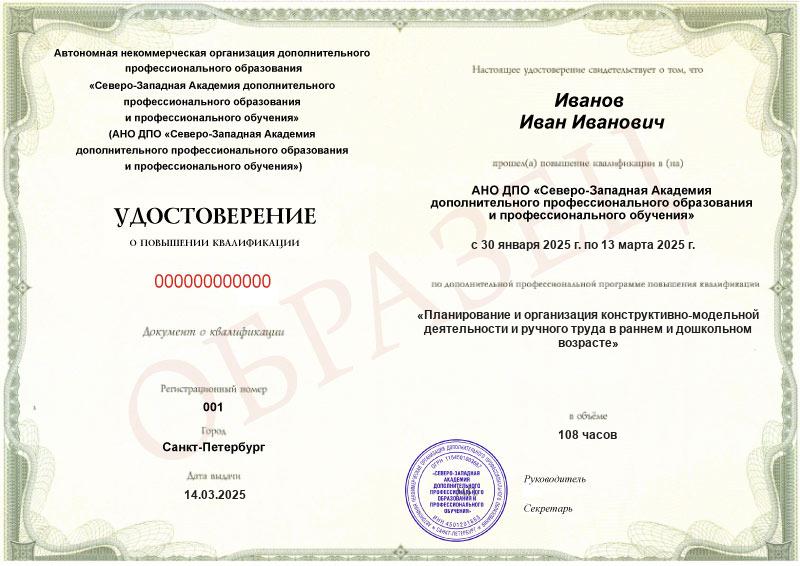 Каждый документ (диплом/удостоверение/свидетельство) соответствует п.2 ст.60 N-273 ФЗ. Диплом/удостоверение/свидетельство оформляется на русском языке, печатается на типографском бланке, защищённом от подделок. Ставится официальная печать образовательной организации. С образцами документов можно ознакомиться на сайте в разделе «Лицензия и документы».